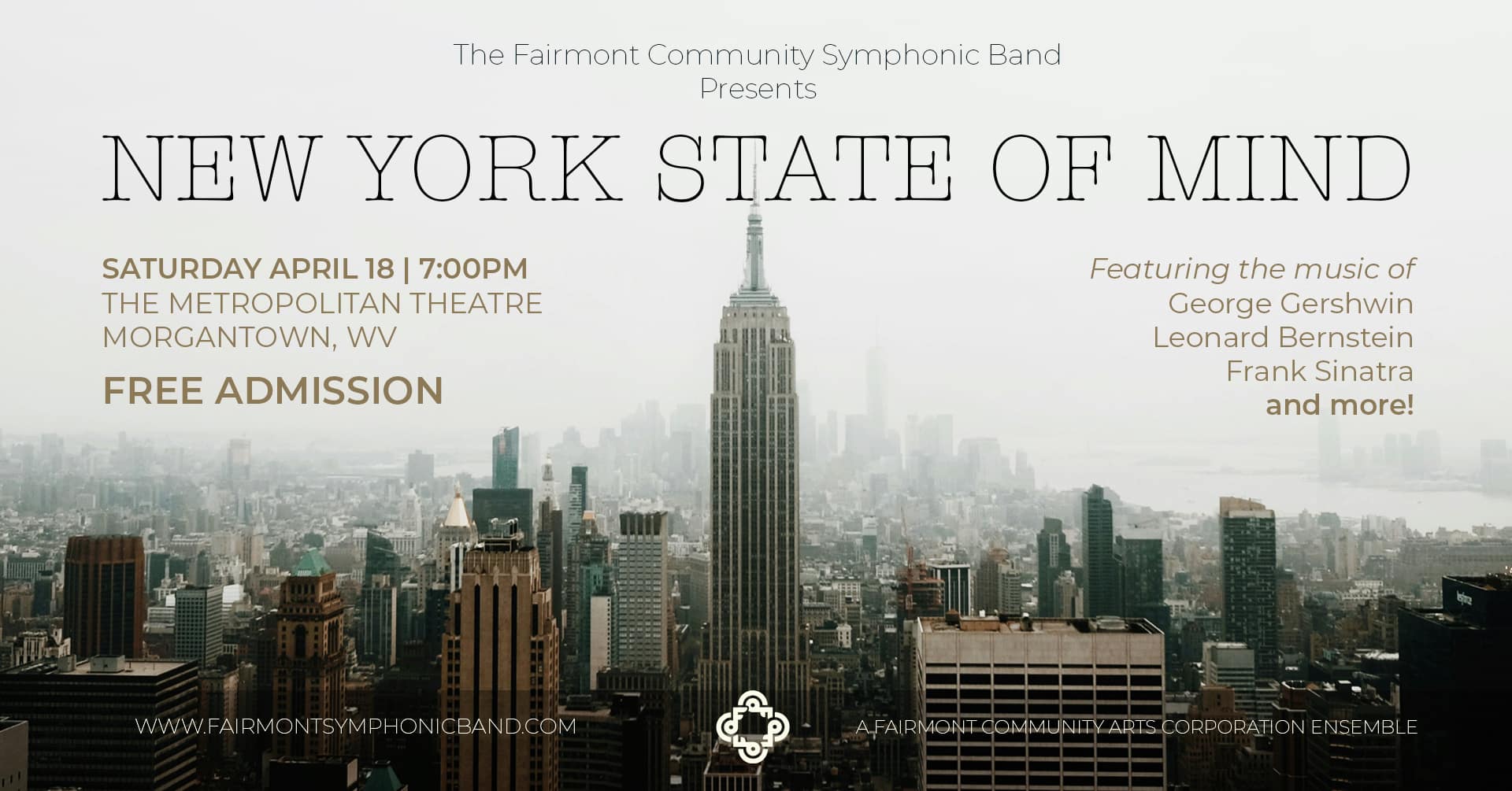 The Fairmont Community Symphonic Band will bring the energy, rhythm, and spirit of New York City to north-central West Virginia this spring with a concert titled “New York State of Mind.” The program will feature a dynamic collection of works inspired by the sights, sounds, and culture of America’s most iconic metropolis.